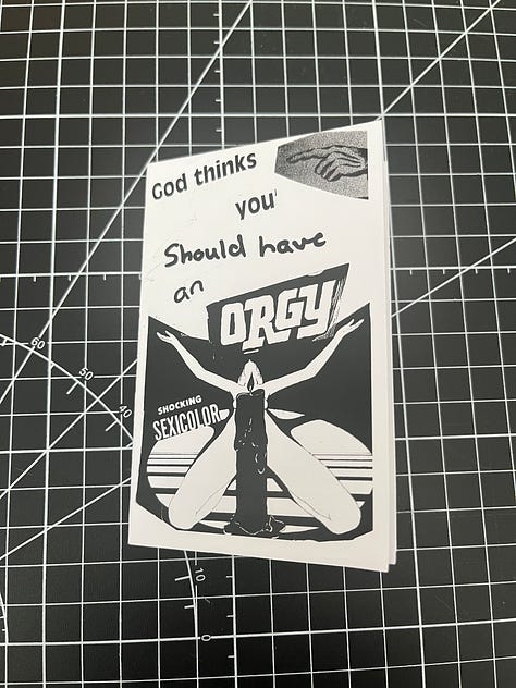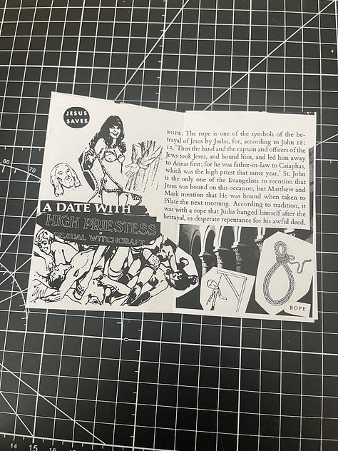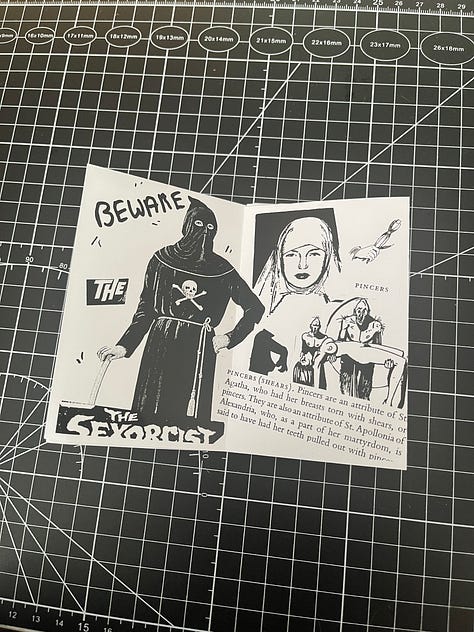 I made one too, inspired by the religious and historical images I found concerning the topics of torture and martyrdom. There is more overlap there than one might initially think. To prove it, I made a defiantly sacrilegious zine, combining random images from issues of Crap Hound and Monsterama with illustrations and descriptions from a book chapter on early Christian Symbols. What resulted is something I’m not entirely sure will ever earn me points with the more religious among us, so I understand if posting this might lose me more than just a few subs.