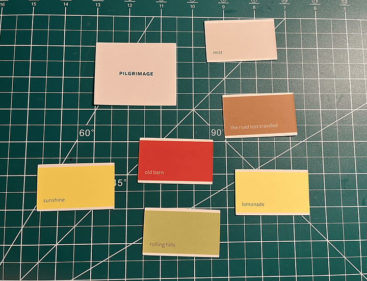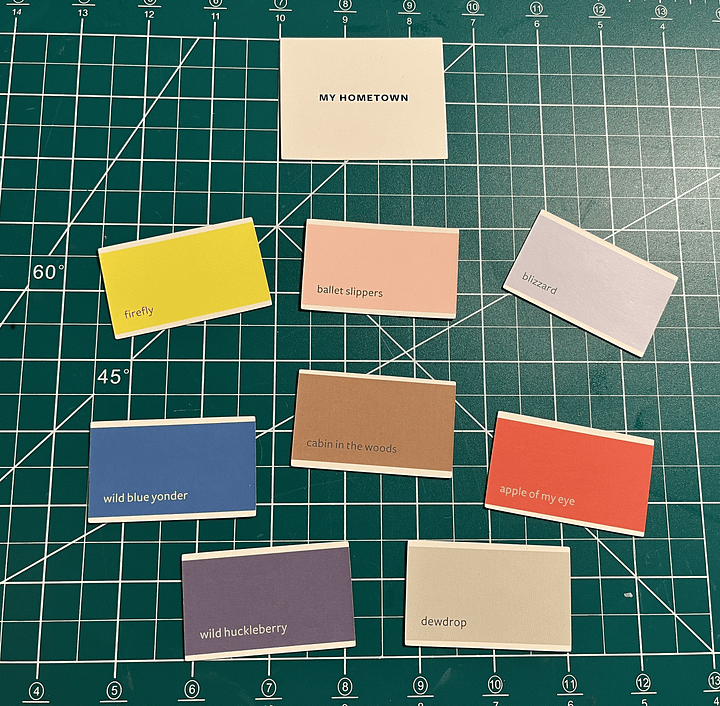 I must choose a prompt and four-to-eight paint chips at random. I get a single opportunity to re-draw a sample if I’m not feeling it, but that’s it. Just one. However, I can redraw if I get a repeat.