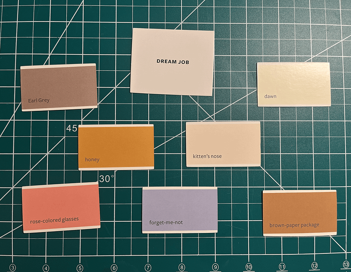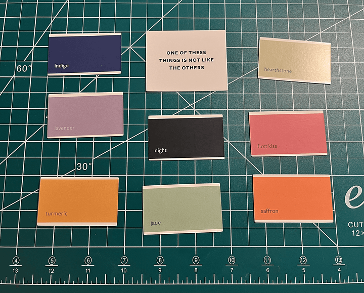 I must choose a prompt and four-to-eight paint chips at random. I get a single opportunity to re-draw a sample if I’m not feeling it, but that’s it. Just one. However, I can redraw if I get a repeat.