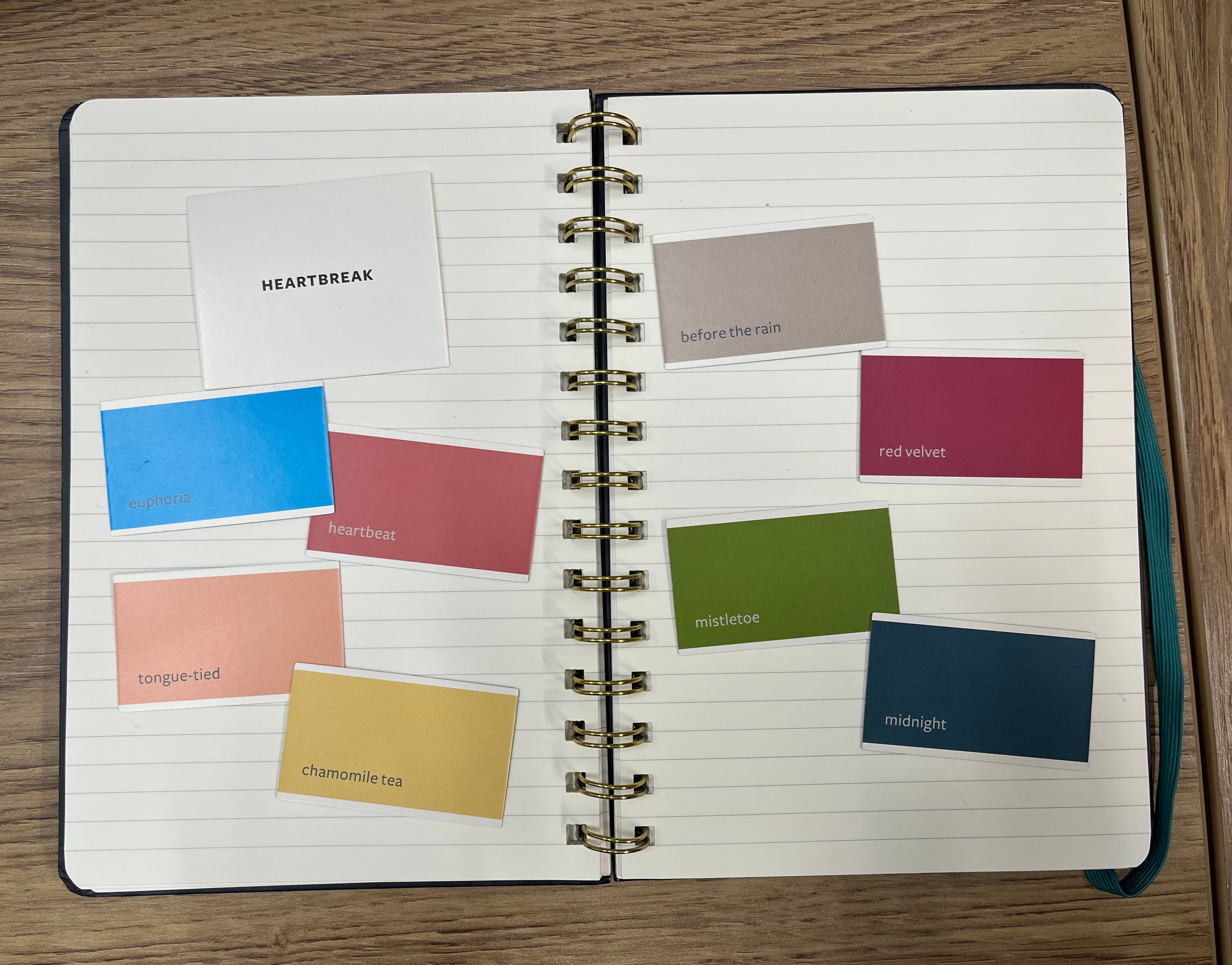 I must choose a prompt and four-to-eight paint chips at random. I get a single opportunity to re-draw a sample if I’m not feeling it, but that’s it. Just one. However, I can redraw if I get a repeat.