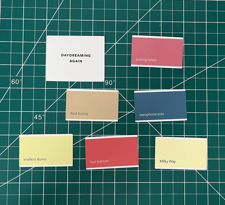 While browsing an art supply store recently, I came across a small game box filled with small paint chips and prompts—simple building blocks with which to create infinite poems and colorful sequences.