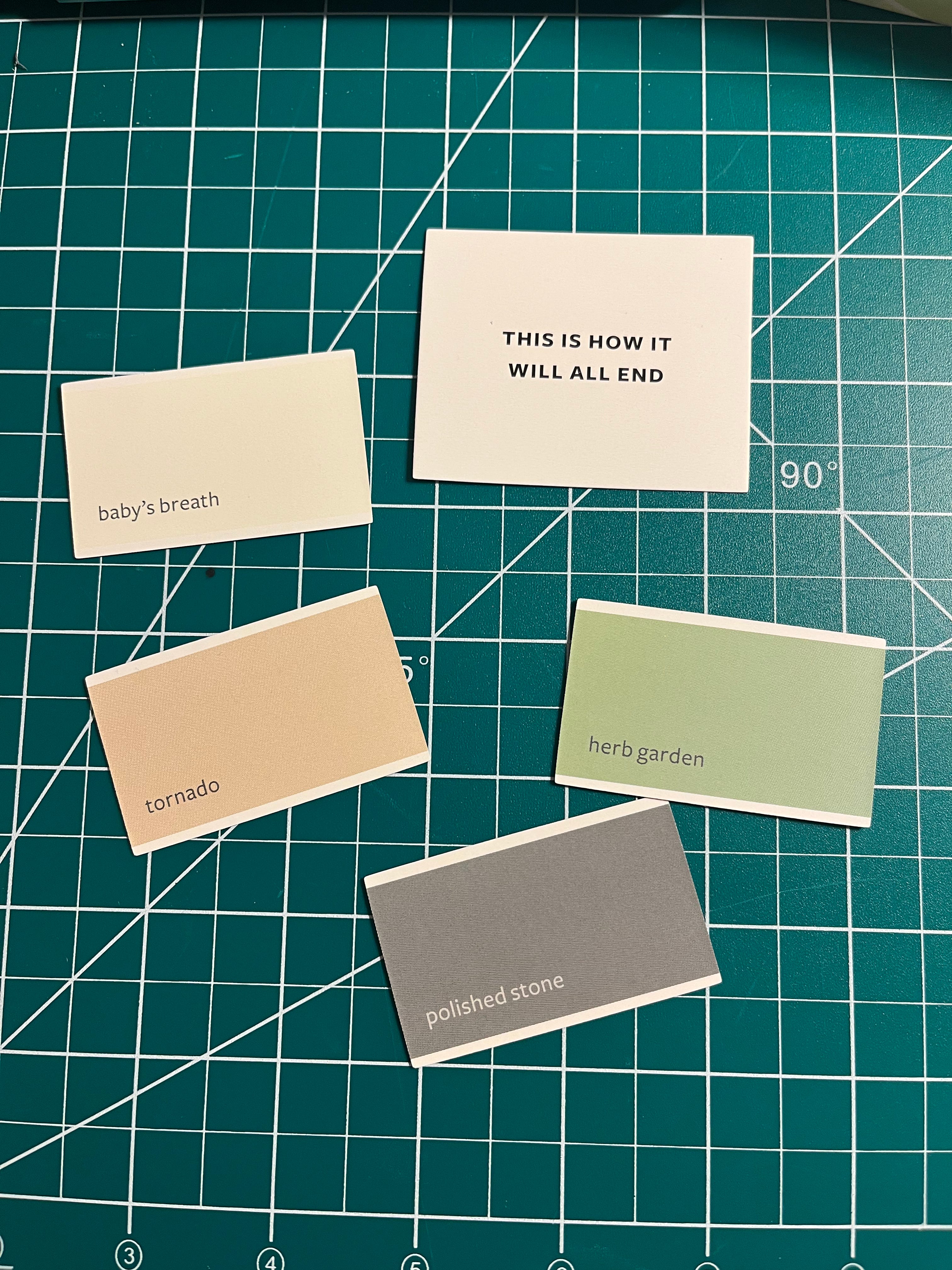 I must choose a prompt and four-to-eight paint chips at random. I get a single opportunity to re-draw a chip if I’m not feeling it, but that’s it. Just one. However, I can redraw if I get a repeat.